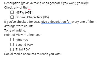 | $15 base fee (includes 500 words) | +$1 every 100 words after 500 | +$5 for NSFW | +$5 for every original character |